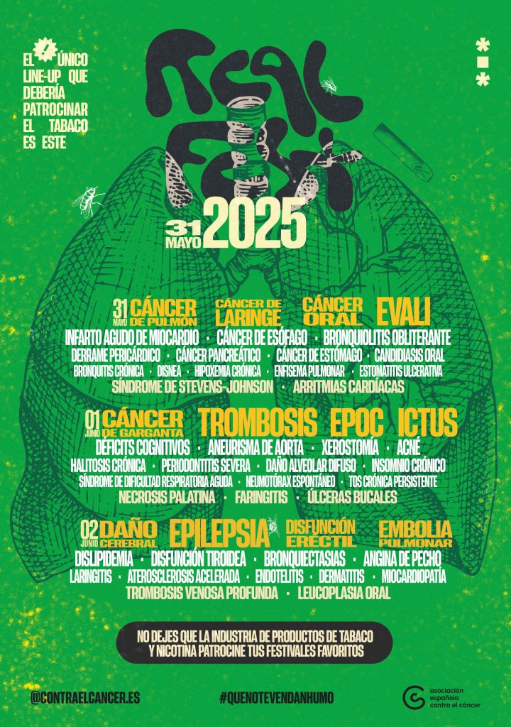 Conscientes del grave impacto de estas estrategias, desde la Asociación Española Contra el Cáncer lanzamos Real Fest, una campaña que simula un festival musical para visibilizar los efectos del tabaco y sus nuevas formas de consumo. En lugar de artistas, nuestros carteles presentan los riesgos reales: enfermedades, adicción y muerte.